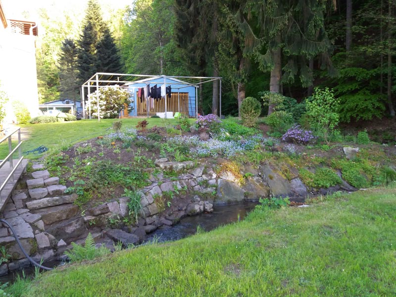 An unserem Grundstück fließen die Sebnitz sowie der Goldgrubenbach entlang/hindurch. Für Hunde, die gerne ins Wasser gehen (so wie unsere Altdeutsche Schäferhündin) ein kleines Paradies zum Baden, toben und mehr.